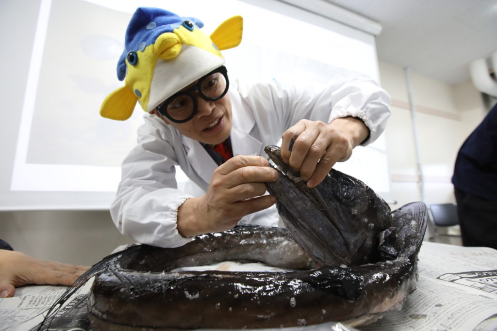 そして午後のハイライトは、ミズウオの解剖体験です。ミズウオは、体長約1〜2メートル、水深900〜1400メートルの深海に生息する魚で、流れてきたものをえり好みせずに飲み込む習性があります。この特徴から、海洋汚染の状況を知る指標として世界中の研究者に注目されています。解剖にはさかなクンも隊員たちにとってはほとんどが初めての解剖体験で、実際にミズウオを解剖してみると、おどろきの連続でした。